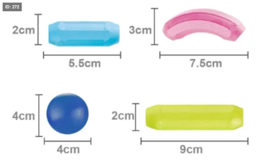 تتضمن قطعًا على شكل قضبان، دوائر، مجرفة، كرات، وعجلات.